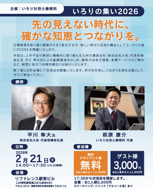 • 事務所方針発表及び法制度アップデート情報(いろり社労士事務所 代表 萩原 康介)